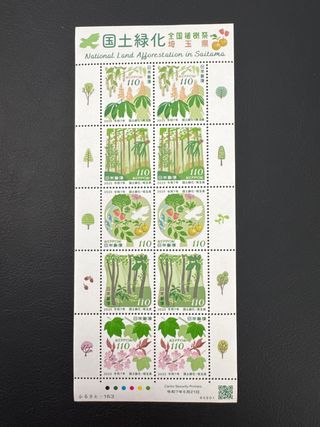 Hoja de sellos con motivos de naturaleza y flores de Japón. - Ilustraciones de árboles y flores. - Diseño conmemorativo de forestación nacional en Saitama. - Valor facial de 110 yenes.