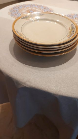 Con sus sellos 5 platos de cerámica antigüa con un elegante borde dorado y un diseño decorativo. (Ver fotos) 22/23 cms diámetro - Diseño con detalles florales y geométricos. - Borde con acabado dorado. - Base de cerámica resistente.