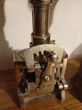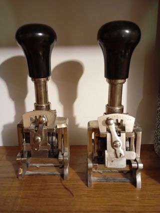 Conjunto de dos sellos antiguos con estructura metálica y mangos negros. - Mecanismo de ajuste de números. - Diseño robusto y clásico.
