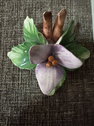 Pieza de porcelana Capodimonte con diseño floral en tonos morados y verdes, que mide 8cm incluyendo los dos tallos marrones que posiblemente indican que se creó como palillero o un portavelas. - Fabricado en Italia, a mano - Detalle de preciosas y delicadas hojas verdes y flores moradas - Base con sello de la prestigiosa marca Italiana CAPODIMONTE - Ideal como regalo exclusivo, delicado, vintage y único -Precio negociable