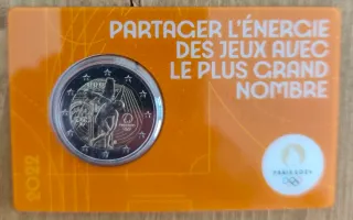Coincard conmemorativa de Francia del año 2022, con motivo de los Juegos Olímpicos de París 2024. - Diseño especial Faire de Paris et de la France le plus beau terrain de sport. - Incluye moneda de 2 euros. - Sello oficial de París 2024.