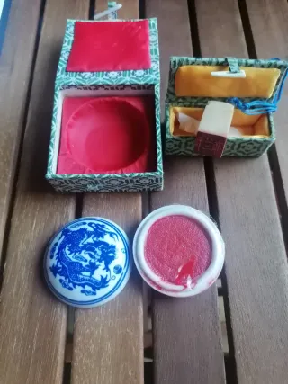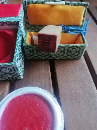 Conjunto de sello chino tradicional de piedra con su estuche. - Sello de piedra con caracteres grabados. - Caja de presentación con interior de seda. - Tinta de color rojo.