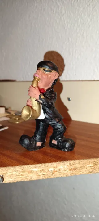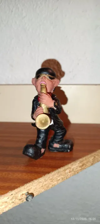 Figura decorativa de un músico tocando el saxofón. Ideal para coleccionistas o amantes de la música. - Diseño detallado. - Acabado en tonos dorados y negros.