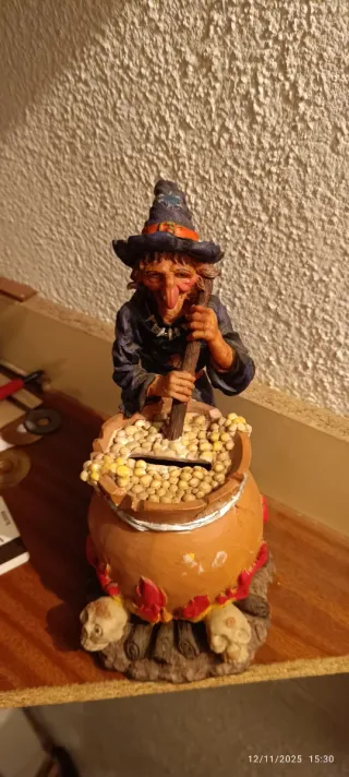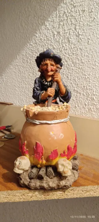 Figura hucha decorativa de una bruja con un caldero. - Diseño detallado de bruja con sombrero y vestimenta. - Caldero con efecto de fuego y calaveras. - Se hace envío - Escucho ofertas - Preguntar sin compromiso