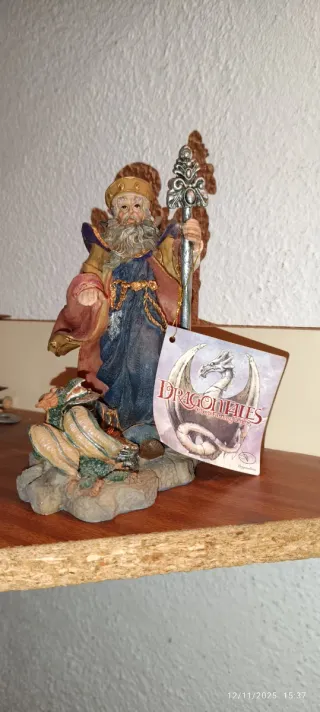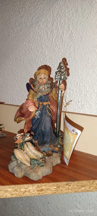 Detallada figura de un mago con barba larga, túnica y bastón, acompañado de un pequeño dragón a sus pies. La figura está elaborada con gran atención al detalle en sus vestimentas y expresiones. - Figura de mago con dragón. - Diseño intrincado. - Base texturizada.. - Se hace envío - Escucho ofertas - Preguntar sin compromiso
