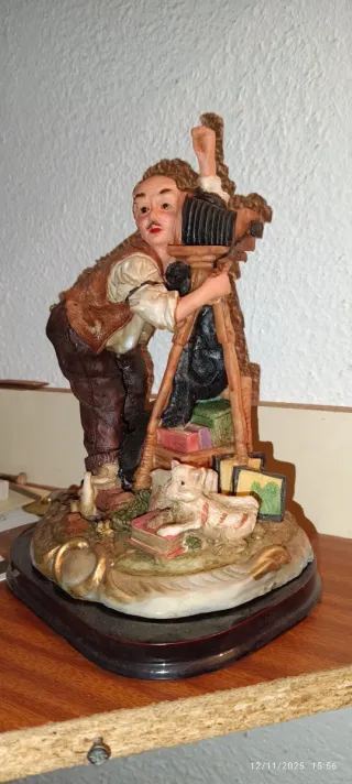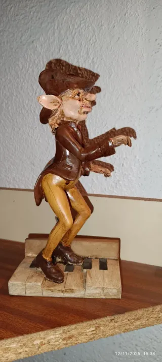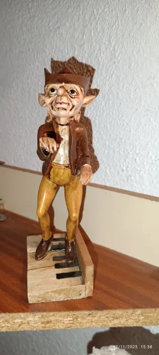 Figura decorativa de un duende con sombrero y chaqueta, posado sobre una base que simula un piano. - Detalles tallados en madera. - Colores tierra y marrones. - Se hace envío - Escucho ofertas - Preguntar sin compromiso