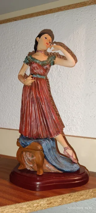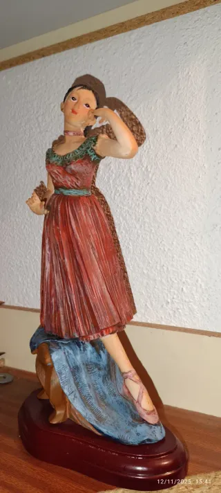 Preciosa figura decorativa de una mujer vestida de bailarina. - Detalle de vestido rojo y azul. - Base de madera oscura. - Se hace envío - Escucho ofertas - Preguntar sin compromiso