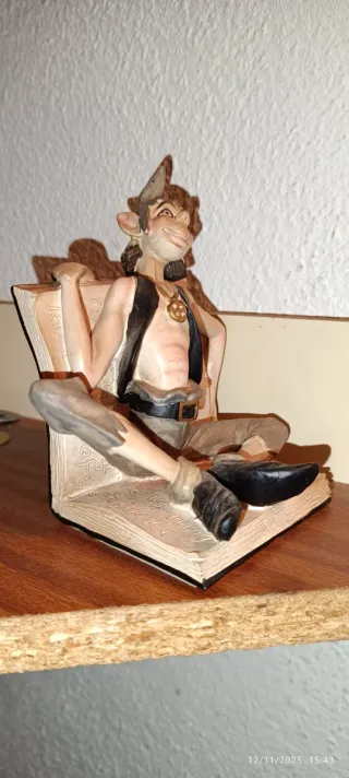 Figura decorativa de un duende con sombrero puntiagudo y chaleco. - Detalles pintados a mano. - Base con diseño de libro abierto. - Colgante con símbolo dorado. - Se hace envío - Escucho ofertas - Preguntar sin compromiso