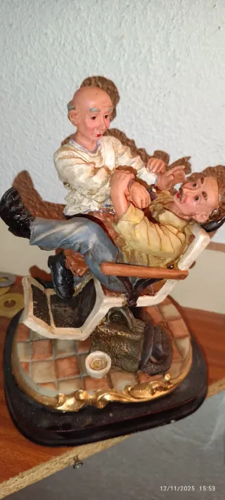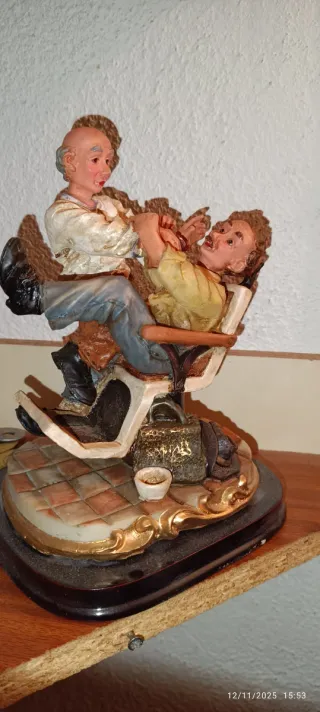 Figura decorativa que representa una escena de barbería. - Detallada figura de un barbero y su cliente. - Base decorada con motivos de baldosas y adornos dorados. - Se hace envío - Escucho ofertas - Preguntar sin compromiso
