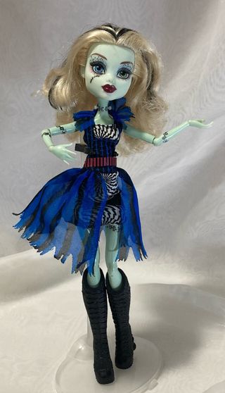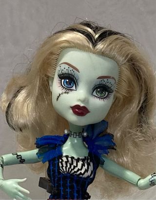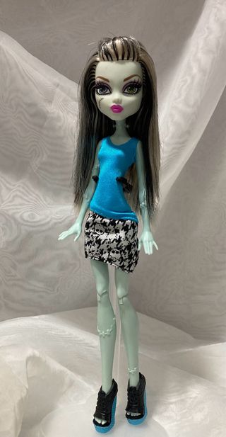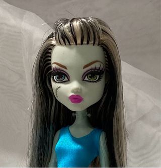 Muñeca de la popular serie Monster High. Frankei freak du chic - Diseño característico de la marca. - Cabello rubio con mechones negros. - Vestimenta detallada con motivos azules y blancos.