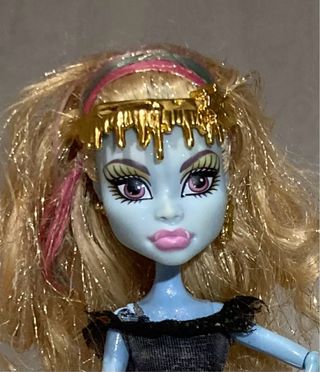 Muñeca de la colección Monster High. - Pelo rubio con mechas rosas y azules. - Diadema dorada con diseño. - Piel de tono azulado. - Sin peana