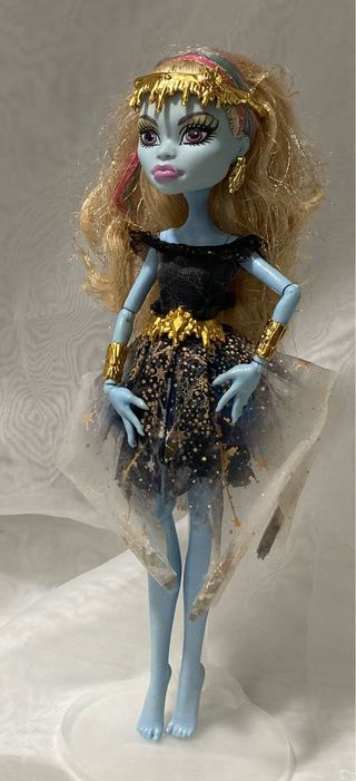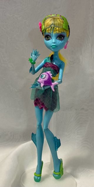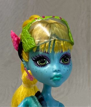 Muñeca de la marca Monster High. - Color de piel azul. - Cabello rubio. - Accesorios de cabeza y orejas. - Maquillaje con detalles.