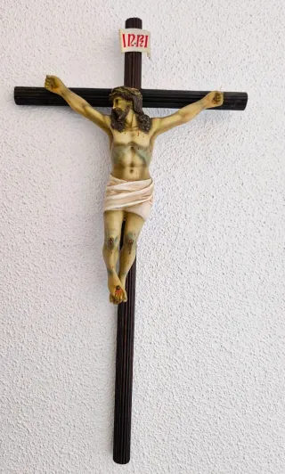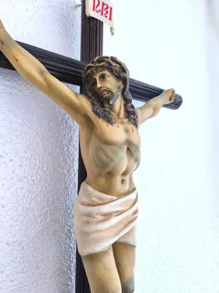Figura religiosa de Jesús crucificado, ideal para devoción o decoración. - Representación detallada de la figura de Jesús de cerámica. - Cruz de madera oscura. - Inscripción INRI en la parte superior. Es muy frágil para enviar.