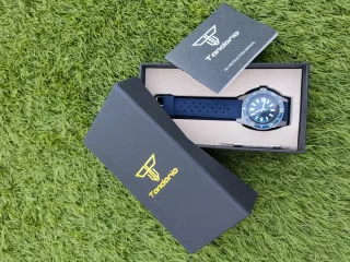 Reloj de pulsera Tandorio modelo 62 MAS con correa de caucho azul. Utilizado en contadas ocasiones, sin marcas de uso. - Esfera azul con fechador a las 3 - Correa de caucho azul. - Bisel giratorio cerámico Caja de 40 mm de acero Corona roscada Tapa trasera roscada Mecanismo automático NH35 Cristal de zafiro abovedado Con caja y papeles. Más relojes en mi perfil