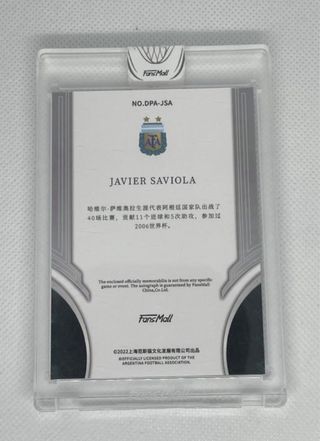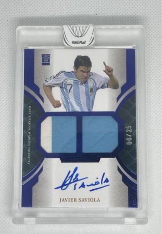 Tarjeta de colección del futbolista Javier Saviola. - Autografiada por el jugador. - Incluye parche de tela. - Edición limitada: 06 de 25.