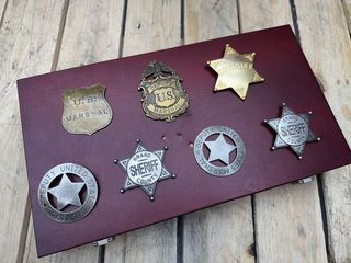 Lote de 7 insignias metálicas estilo western con diseños de Sheriff y US Marshal. Vienen presentadas en un elegante estuche de madera con interior forrado. Ideal para coleccionistas, escaparatismo o regalo original. Piezas con acabado envejecido y gran nivel de detalle. WD2505141101