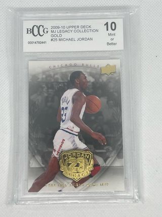 Tarjeta de baloncesto Michael Jordan, edición 2009-10 Upper Deck MJ Legacy Collection Gold. - Grado BCCG 10 (Mint or Better). - Incluye inserto Jordan Legacy 23. - Conmemora el MVP del All-Star Game de la NBA de 1988.