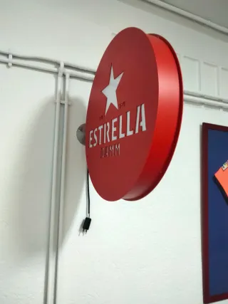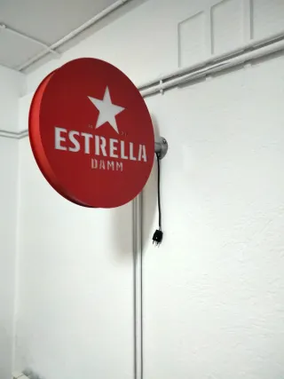 Rótulo luminoso de la marca Estrella Damm, ideal para decoración. - Diseño circular en color rojo. - Estrella blanca. - Texto ESTRELLA DAMM en blanco.