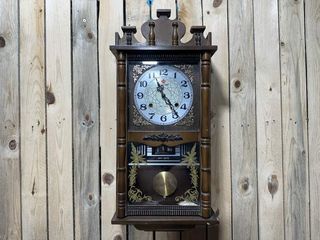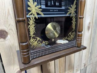 Reloj de pared Master modelo Day Date, con caja de madera estilo clásico y péndulo. Esfera con calendario día y fecha, números grandes y fácil lectura. Presenta pequeñas marcas de almacenaje, pero no ha sido usado. Diseño elegante y atemporal, ideal para salón, comedor o despacho. WD2508251054