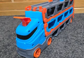 Pack de camiones Hot Wheels con diseño de tiburón. - Camión con forma de tiburón. - Colores azul y naranja. - Ruedas naranjas.