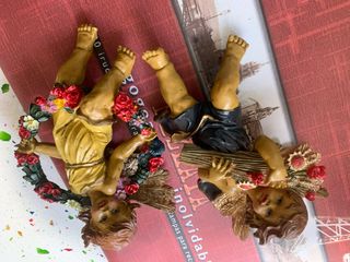 Conjunto de dos figuras decorativas de ángeles, ideales para añadir un toque especial a tu hogar. - Diseño detallado con flores y alas. - Colores cálidos y acabados cuidados.