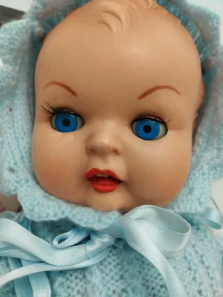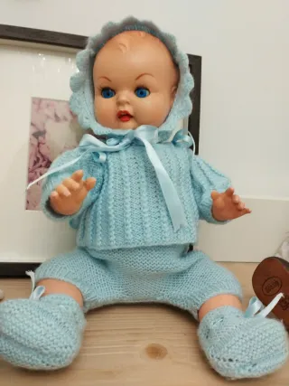 Muñeco de bebé Molina con un bonito traje azul tejido. Cómo se aprecia en fotos tiene manchas que no me he trevido tocar por lo demás bien para los años que tiene ojos móviles un brazo se ve más claro que el otro el llorón no funciona