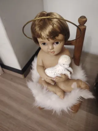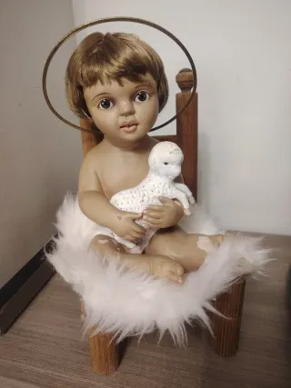 Figura de Niño Jesús de Olot sentado en una silla de madera, acompañado de un tierno cordero. La figura está adornada con un nimbo dorado y reposa sobre un suave cojín de pelo sintético blanco. - Figura de Niño Jesús de Olot. - Incluye cordero. - Silla de madera. - Nimbo dorado. - Base de pelo sintético blanco.