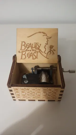 Vendo esta preciosa caja de música artesanal con grabado de La Bella y la Bestia. Está en perfecto estado, suena genial y queda ideal como regalo, decoración o para darle un toque mágico a cualquier rincón. Caja de madera con grabados en tapa y laterales Mecanismo de manivela, sin pilas (eco-friendly y a prueba de apagones) 🎁 Ideal para: fans de Disney, amantes de lo vintage, coleccionistas o para quedar fenomenal con un regalo barato pero con encanto