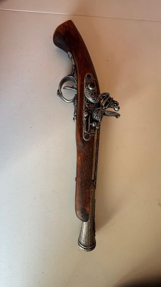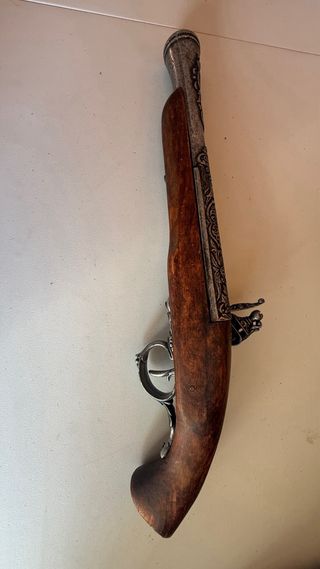 Réplica de pistola antigua con detalles ornamentales. - Empuñadura de madera. - Mecanismo de metal con grabados. - Cañón y detalles metálicos plateados.