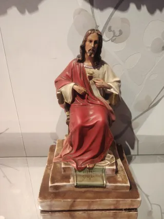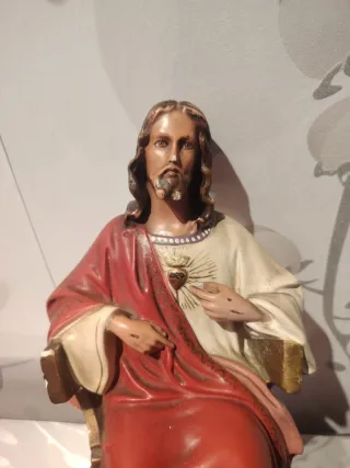 Figura del Sagrado Corazón de Jesús, datada de los años 70. - Representación sentada. - Túnica roja y blanca. - Base con inscripciones.