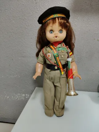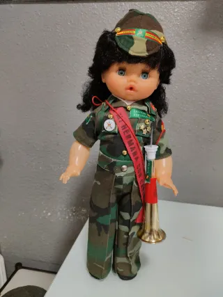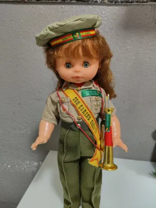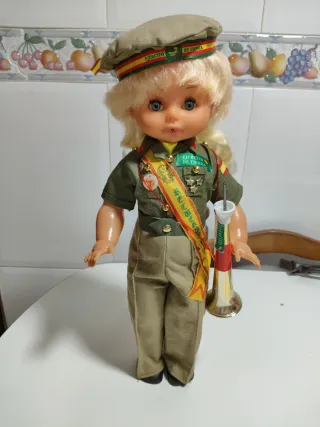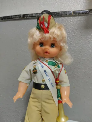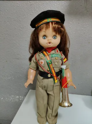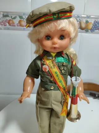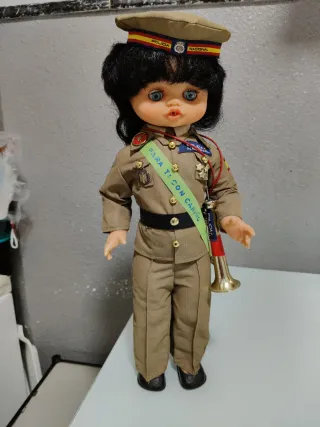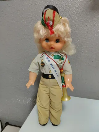Muñeca funcionando con uniforme militar del Ejército de Tierra.mide43cm ojos durmientes brazos y piernas articulados toca el quinto levanta cuando se le pone la trompeta se entrega funcionando limpia y pila nueva tengo más modelos de muñecas en mi perfil si tienen dudas mirar mis valoraciones - Incluye gorra con distintivos. - Viste traje de campaña con medallas y banda. - Porta una corneta dorada.