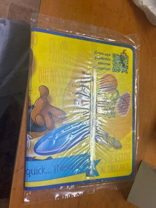 Salvamanteles individual con diseño de Nesquik. - Incluye información de importación y advertencias de seguridad. - Presenta un código QR para interactuar. - Diseño colorido con motivos de frutas y el personaje de Nesquik.