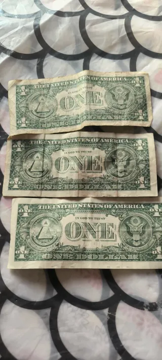 Conjunto de tres billetes de 1 dólar estadounidense. - Billetes de colección. - Cada billete tiene un número de serie único. Menedeas de diferentes países