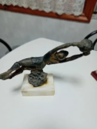 Figura decorativa de un portero de fútbol en acción, con un balón en las manos. La pieza está montada sobre una base de mármol. - Base: Mármol