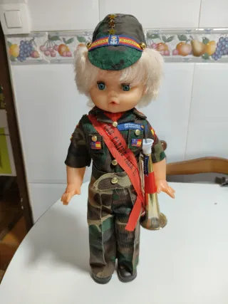 Muñeca funcionando vestida con uniforme de camuflaje de la infantería de marina.mide 43cm ojos durmientes brazos articulados toca el quinto levanta cuando se le pone la trompeta se entrega funcionando limpia y pila nueva tengo más modelos de muñecas en mi perfil si tienen dudas mirar mis valoraciones si me facilitan un tlf le mando un video - Gorra con emblema. - Pañuelo rojo con banda cruzada. - Incluye trompeta dorada.