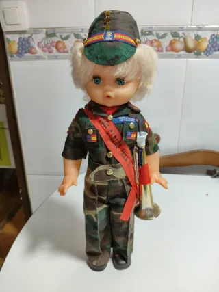 Muñeca funcionando con uniforme de la Legión Española.de camuflaje mide43 toca el quinto levanta cuando se le pone la trompeta se entrega funcionando limpia y pila nueva tengo más modelos de muñecas en mi perfil si tienen dudas mirar mis valoraciones si me facilitan un tlf le mando un video - Uniforme de camuflaje. - Gorra con distintivos. - Correa roja con texto. - Incluye trompeta dorada.