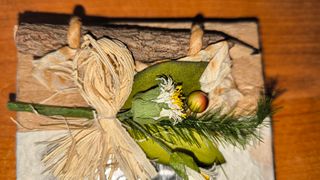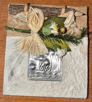 Mini bloc decorativo con un diseño artesanal único. - Adorno metálico de elefante, con la trompa hacia arriba. - Elementos naturales como madera y paja. - Flores secas y follaje. - Papel texturizado. - Medidas: 11cm x 10cm x 1,5cm aprox. Ideal para amigo invisible
