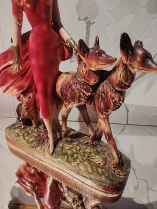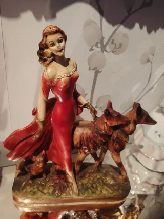 Figura vintage de una mujer paseando perros, estilo años 60. Una pieza decorativa con mucho encanto. - Detalle de la mujer con vestido rojo. - Incluye dos perros y un pequeño animal. - Base decorada con motivos naturales.