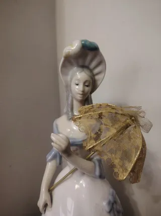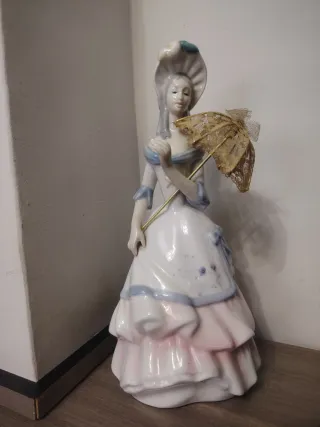 Preciosa figura de porcelana fina de una dama con un elegante paraguas. Una pieza con encanto de los años 70. - Detalle de encaje en el paraguas. - Vestido con volantes y detalles florales. - Adorno en el sombrero.