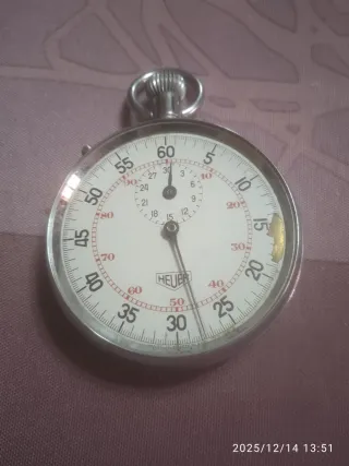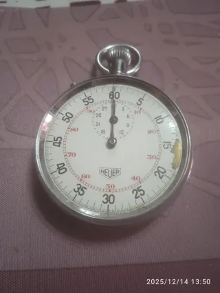 Cronómetro HEUER con esfera blanca y detalles en rojo funciona bien lo único que no se para lo activas y no para la aguja ,resetea bien y le falta el cristal y tiene una marca en el 15 como se ve en las fotos - Marca: Heuer - Esfera: Blanca con números y marcadores en rojo. - Bisel: Plateado.