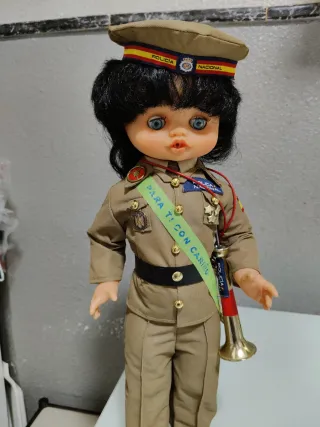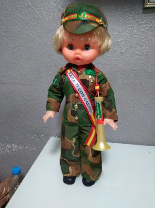 Muñeca funcionando con uniforme de militar del Ejército de Tierra.mide 43cm ojos durmientes brazos y piernas articulados toca el quinto levanta cuando se le pone la trompeta se entrega funcionando limpia y pila nueva tengo más modelos de muñecas en mi perfil si tienen dudas mirar mis valoraciones si me facilitan un tlf le mando un video - Incluye gorra negra con banda tricolor. - Uniforme de color caqui con medallas y distintivos. - Lleva una trompeta dorada con detalles rojos y amarillos.