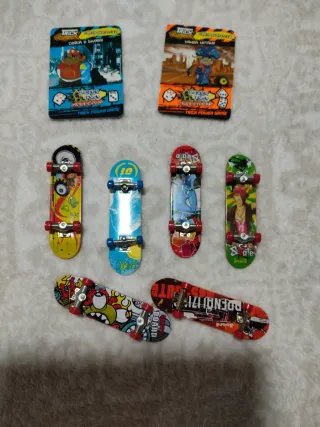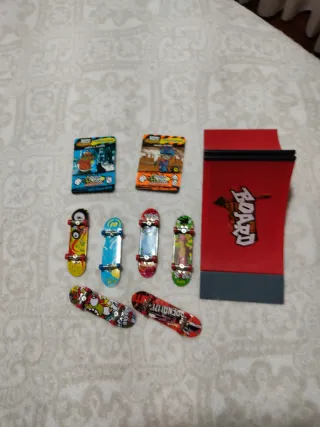 Set de rampa y patinetes en miniatura para jugar. - Incluye una rampa de skate. - Seis patinetes de diferentes diseños.El patinete que se ve en la fotos con una rueda suelta lo doy en el lote . - Ideal para coleccionar o jugar. Los gastos de envío corren a cuenta de quien lo compra.