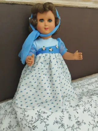 Preciosa muñeca antigua con un vestido azul y blanco. - Vestido con detalles florales bordados. - Pañuelo azul. - Cabello castaño.mide 50