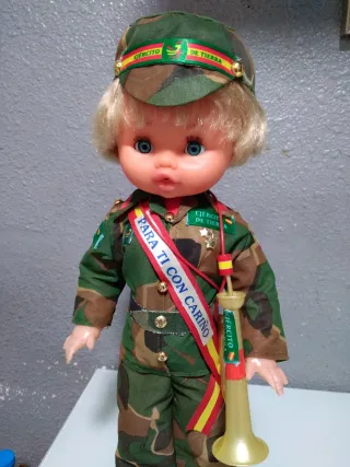 Muñeca funcionando con uniforme militar de camuflaje mide 43cm ojos durmientes brazos articulados toca el quinto levanta cuando se le pone la trompeta se entrega funcionando limpia y pila nueva tengo más modelos de muñeca en mi perfil si tienes dudas mirar mis valoraciones si me facilita un tlf le mando un video - Incluye trompeta dorada. - Lleva una banda con la inscripción PARA TI CON CARIÑO. - La gorra tiene un distintivo con los colores de España y EJERCITO DE TIERRA.