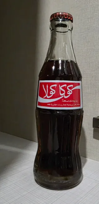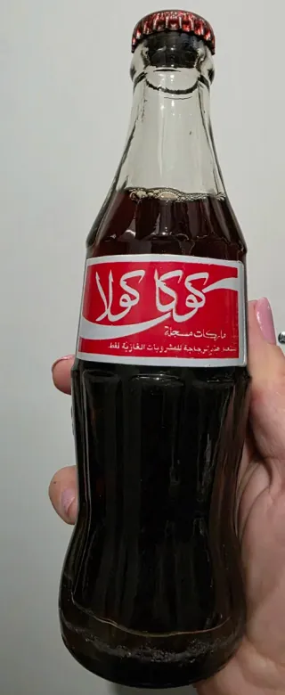 Botella de Coca Cola de vidrio con etiqueta egipcia. 30 años de antigüedad. - Diseño clásico de botella. - Etiqueta con escritura árabe.