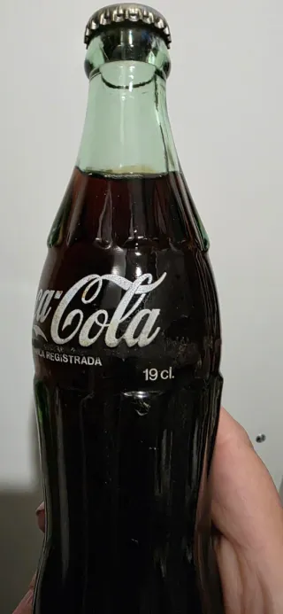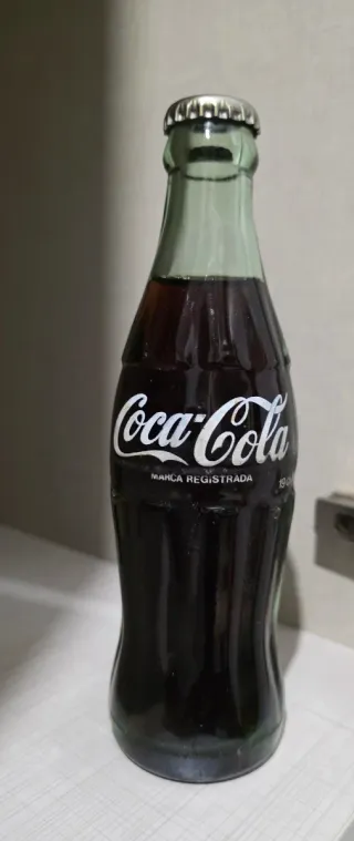 Botella de Coca Cola antigua, un objeto de colección. 30 años de antigüedad. - Diseño clásico de botella. - Etiqueta Coca-Cola con Marca Registrada.