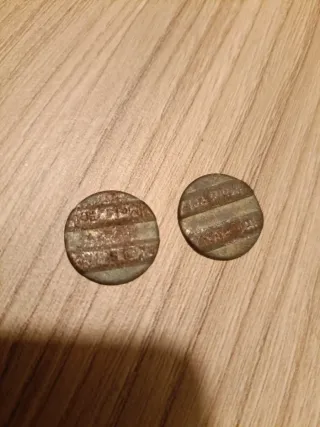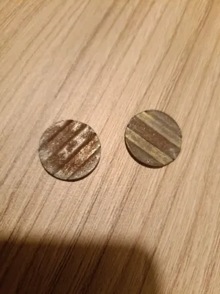Dos fichas de teléfono antiguas con diseño de rayas. - Diseño de rayas horizontales. - Material metálico.