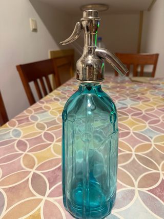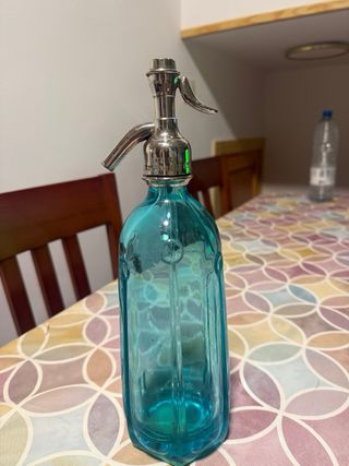 Sifón de vidrio azul con detalles metálicos. - Diseño vintage. - Ideal para coleccionistas o decoración. Tienen como una ampolla en la botella que no afecta al sifon. Mira las fotos. Cualquier duda preguntar.
