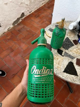 Sifón de vidrio vintage de la marca Ondina, con su característica funda protectora verde. - Modelo: Ondina - Material: Vidrio y plástico - Capacidad: 75 CL - Ingredientes: Agua Carbonatada