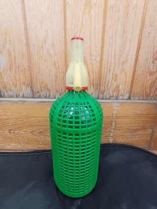 Se vende sifón antiguo para refrescos. Está en buen estado, aunque muestra señales de uso. - Cuerpo de vidrio protegido por una malla metálica. - Mecanismo metálico para dispensar el líquido. - Incluye una boquilla verde.